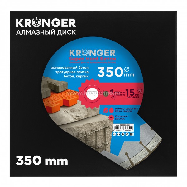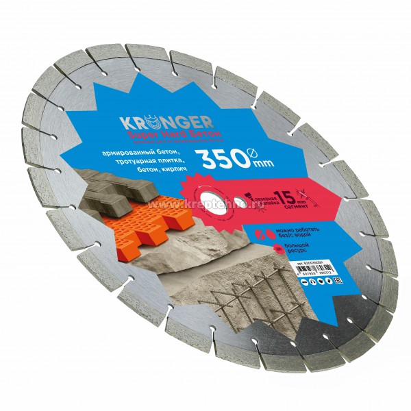 Отрезной алмазный диск по железобетону для болгарки и штробореза 350 мм Super Hard Бетон Kronger с лазерной наваркой алмазного сегмента высотой 15 мм предназначен для работы с железобетоном.
