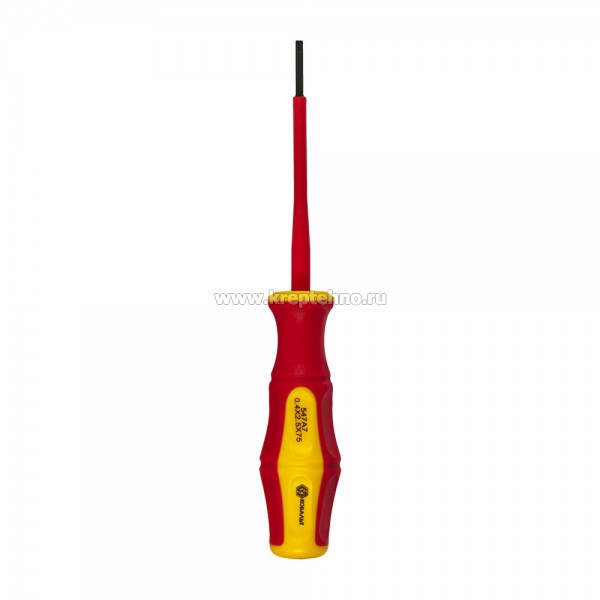 Отвертка диэлектрическая плоская SL 2,5 х 75 мм КОБАЛЬТ 646-430 предназначена для завинчивания/отвинчивания винтов, шурупов и саморезов находящимися под напряжением до 1000 Вольт, при проведении строительно-монтажных работ, сборки/разборки, ремонта различных механизмов, узлов и агрегатов.