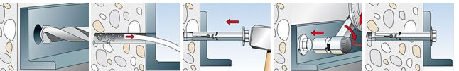 Во время затяжки конус перемещается в распорную втулку и расширяет ее, прижимая к стенкам просверленного отверстия.