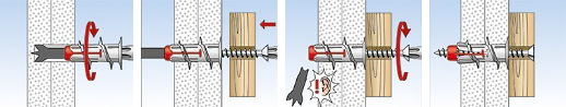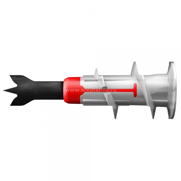 Металлический носик дюбеля. Отламывается при установке шурупа При завинчивании дюбель "раскрывается" лучше аналогов, закрепление в отверстии лучше Самый распространенный шлиц Phillips (PZ 2) для удобной установки большинства инструментами Самосверлящий носик дюбеля с тремя точками опоры, быстрое и эффективное формирование отверстия Дополнительные ребра против прокручивания Плотная посадка в отверстии Монтаж в двухслойный гипсокартон: