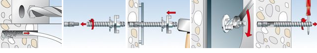 Во время затяжки гайки, конический болт перемещается в распорную втулку и расширяет ее, прижимая к стенкам просверленного отверстия.