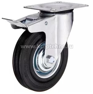 Колеса промышленные поворотные с тормозом состоят из колеса (штампованная сталь, черная резиновая шинка) и поворотной опоры (включает тормозной механизм и площадочное крепление).