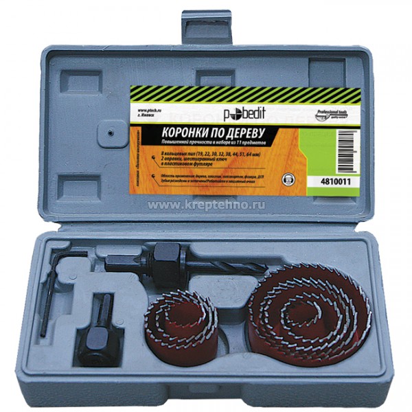 В комплекте 12 кольцевых пил 19 , 22 , 29 , 32 , 38 , 44 , 51 , 64 , 76 , 89 , 102 , 127 мм 2 хвостовика с направляющим сверлом , фиксирующая пластина , шестигранный ключ