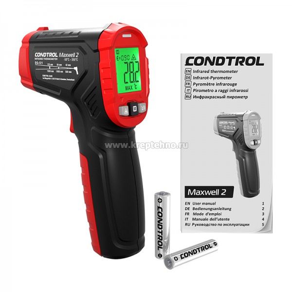 - Пирометр Condtrol Maxwell 2 отличается простотой в использовании, компактными размерами и небольшим весом. Достаточно навести лазерный указатель на объект, нажать на триггер, и результат появится на экране.
