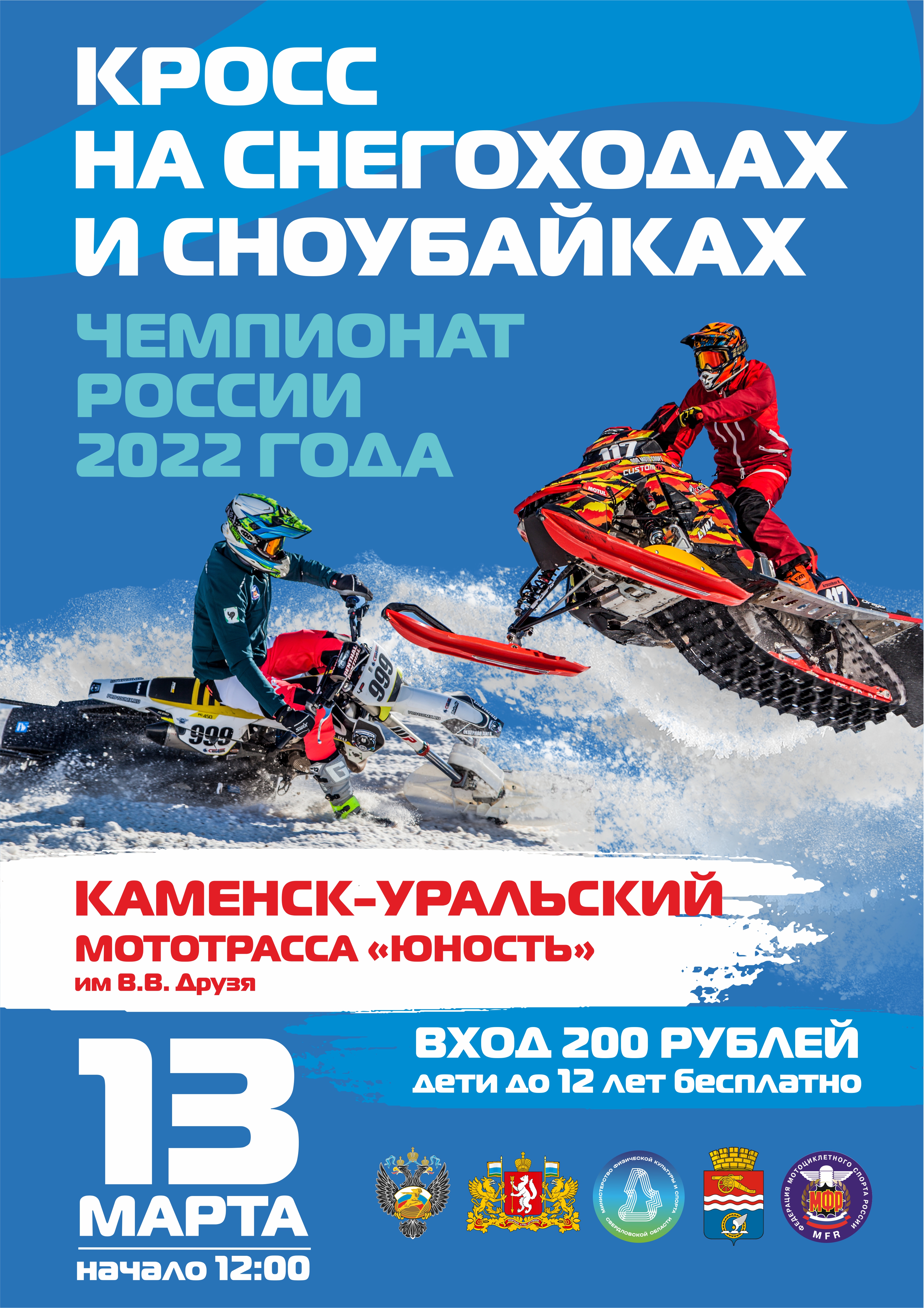 "Крепеж-сити"- спонсор ДЮСШ по техническим видам спорта - приглашает на Чемпионат и Первенство России3 марта '22Каменск-Уральская спортивная школа по техническим видам спорта «Юность-ДОСААФ» при поддержке Управления физической культуры и спорта Каменск-Уральского городского округа, Центра спортивных мероприятий Свердловской области и Мотоциклетной федерации России 13 марта 2022 года проводит на стадионе технических видов спорта «Юность» им. В.В. Друзя (ул. Кадочникова) Чемпионат и Первенство России по кроссу на снегоходах и Чемпионат России по сноубайк-кроссу 2022 года. Ожидаются спортсмены из Ханты-Мансийского АО, Ямало-Ненецкого АО, Республики Татарстан, Республики Башкортостан, Удмуртской Республики, г. Красноярск, г. Омск, г. Новосибирск, г. Екатеринбург. В соревнованиях примут участие именитые российские спортсмены по мотоспорту Бобин Владимир, Муратов Тимур, Петров Никита, Красников Николай, Пестов Антон, Ходырев Виктор. Кросс-сноубайк и кросс на снегоходах, как направление мотоциклетного спорта активно развивается в России уже несколько лет и набирает популярность и завоёвывает сердца болельщиков. Рёв моторов, адреналин и насыщенный накал борьбы спортсменов с соответствующим музыкальным сопровождением и Лучшим комментатором России 2021 года по мнению Мотоциклетной федерации России Михаилом Соколовым, неповторимая атмосфера праздника, энергетика экстрима оставят у каждого незабываемые впечатления и обязательно порадуют любителей зимних экстремальных видов спорта! Начало соревнований: 13 марта 2022 в 12.00 час, вход по билетам – 200 руб, дети до 12 лет бесплатно Директор соревнований – Заслуженный Мастер спорта России Хомицевич Виталий Валерьевич.