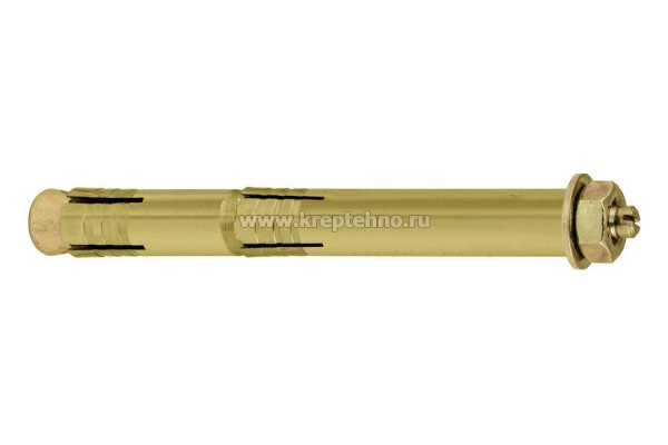 Стальной двухраспорный анкер, оцинкованный, желтого цвета. Изготовлен из высококачественной оцинкованной стали 8-го класса прочности. Является одной из разновидностей анкера с гайкой. Благодаря двум распорным втулкам достигается наиболее надежное крепление монтируемой детали к прикрепляемому материалу.