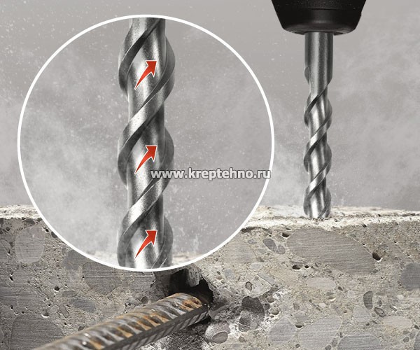 • Тело бура обладает повышенной жесткостью, следовательно, меньше подвержено колебаниям в процессе бурении, что улучшает точность просверливания отверстий, снижаем износ тела бура и вибрации перфоратора.