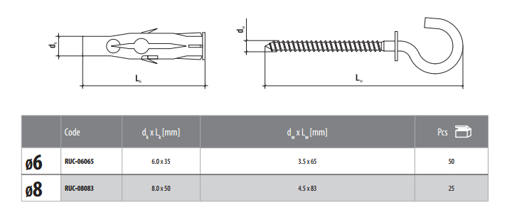 Дюбель распорный RUC 8х83 с потолочным крюком Wkret-met, Польша