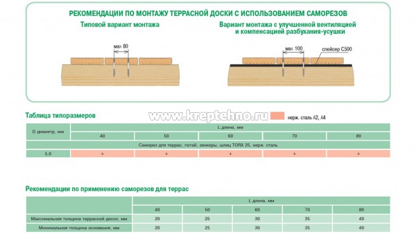 Террасные саморезы предназначены для крепления гладкой или рифленой террасной доски из древесины  на подготовленное ровное  деревянное основание.