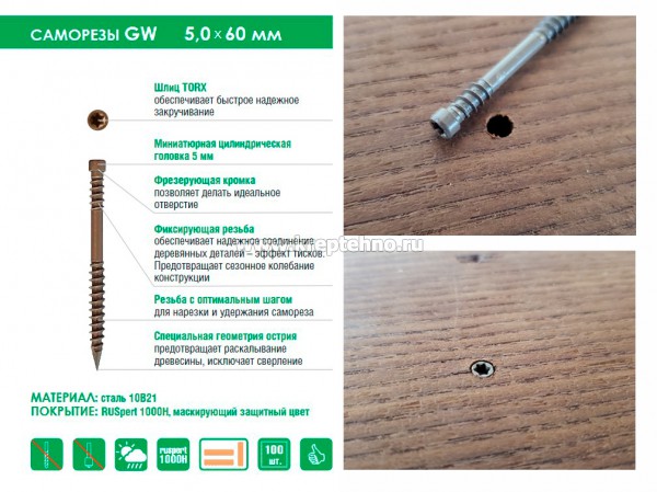 Саморезы для террас с защитным покрытием Русперт 1000 произведены из качественной углеродистой стали,  допускается их постоянный контакт с пресной водой  и  увлажненной древесиной, что делает их незаменимыми при креплении террасных или палубных досок  на улице, прибрежных пирсах  или в помещениях с повышенной влажностью.