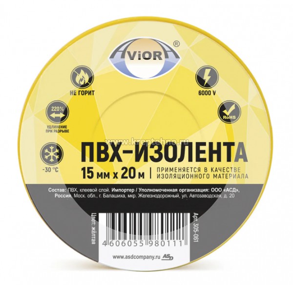 Купить Изоленту желтую AVIORA в Екатеринбурге и Свердловской области можно в сети магазинов КРЕПЕЖ-СИТИ.