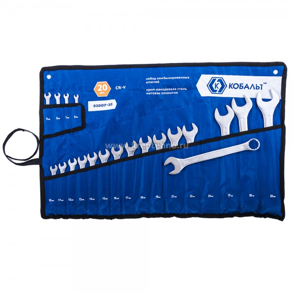 Набор ключей комбинированных 20 шт. КОБАЛЬТ 020107-20, предназначен для отвинчивания/завинчивания резьбового крепежа с шестигранными головками при производстве строительных, электротехнических, монтажных и автосервисных работ.