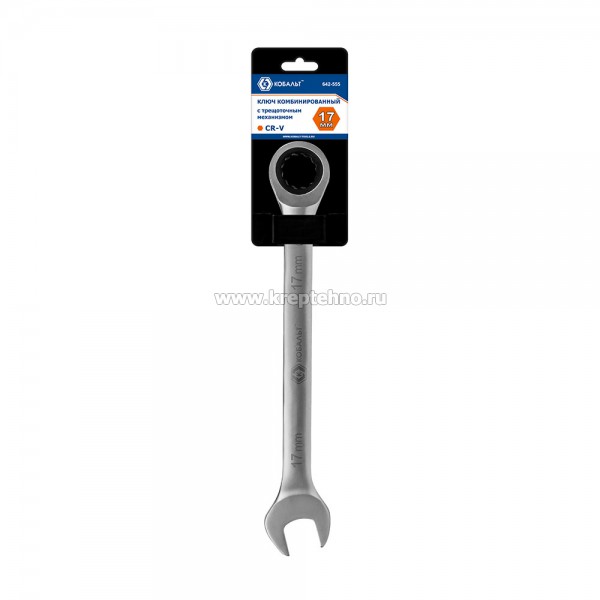 Ключ комбинированный трещоточный 17 мм КОБАЛЬТ 642-555, предназначен для отвинчивания/завинчивания мелкого резьбового крепежа с шестигранными головками при производстве строительных, электротехнических, монтажных и автосервисных работ.