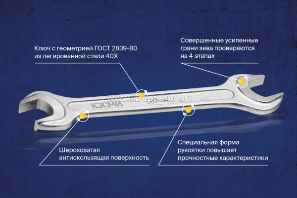 Ключ имеет цельнометаллическую конструкцию, рабочий элемент захватывает две параллельные грани гайки либо болта.