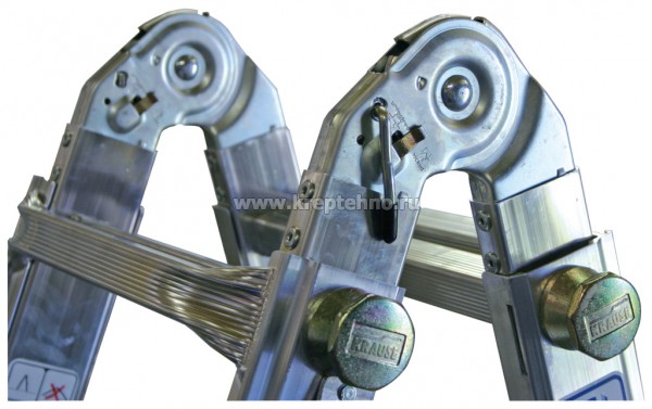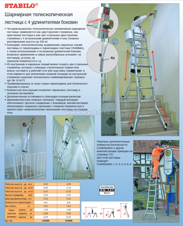 Лестница шарнирная телескопическая 4х5 перекладины, рабочая высота 6,05м STABILO KRAUSE Четырехсекционная шарнирная лестница из алюминия Может использоваться как две отдельные двусторонние стремянки с 4 встроенными удлинителями стоек, как приставная лестница и как двусторонняя стремянка Телескопическое выдвижение наружных секций лестницы от перекладины к перекладине (система ClickMatic) позволяет использовать ее в разных условиях Из внутренних и наружных секций можно создать две отдельные стремянки Перекладины профилированы со всех сторон Угловые раскосы обеспечивают дополнительную устойчивость Опорные заглушки двухкомпонентные, из твердого и мягкого материалов Твердый для прочного соединения с боковиной, а мягкий для сцепления с опорной поверхностью и предотвращения скольжения лестницы Технические характеристики: