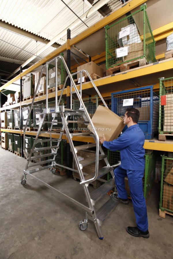 Небольшая ширина подходит для использования среди стеллажей Платформа 600 х 700 мм из рифленого алюминия Двухстороннее ограждение платформы высотой 1,0 м, с защитной планкой на уровне колен и плинтусом Надежное соединение поручней с ограждением платформы обеспечивают высокую безопасность 4 поворотных ролика (Ø 125 мм), 2 из них с тормозами, обеспечивают легкую эксплуатацию и безопасное использование Поставка осуществляется в предварительно собранных модулях Начиная с высоты платформы 1,00 м, с обеих сторон требуются поручни в соответствии с DIN EN 131-7. Соответственно, поручни должны заказываться как необходимые аксессуары. Продукт сертифицирован в строгом соответствии с ГОСТ Р 58752-2019 и DIN EN-131 Рабочая высота: 3,90м Ступеней 2х8 A ≈ м 3,90