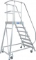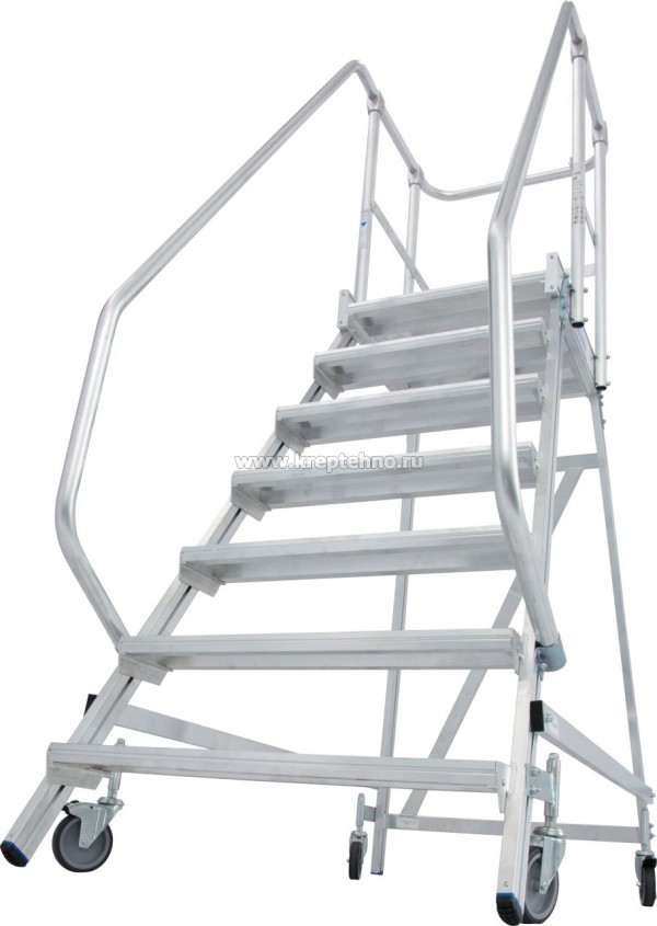 Односторонняя передвижная алюминиевая лестница с платформой. Широкие ступени, трехстороннее ограждение и большая платформа для удобства и безопасности при работе.