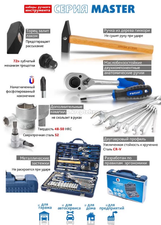 В наборе собраны инструменты общего назначения, необходимые для работы в гараже, мастерских и автосервисах.