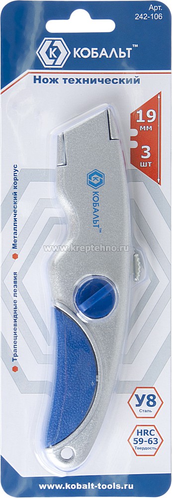 - В комплекте 3 двусторонних трапециевидных лезвия размещенных в корпусе ножа. Рекомендуется использовать лезвия Кобальт Арт. 242-021.