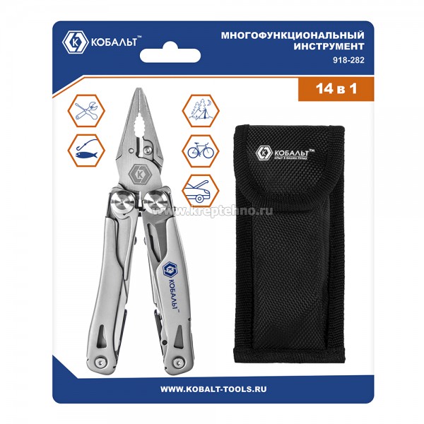 Нож-мультитул 14 в 1, корпус из нерж. стали, 2-х компонентные рукоятки из алюминия и ABS пластика, чехол, КОБАЛЬТ