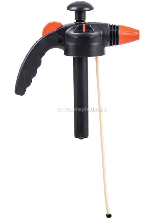 - Принцип работы: с помощью насоса создаётся давление в баке, распыл жидкости осуществляется нажатием на клавишу ручки.