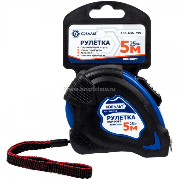 Рулетка 5м*25мм обрезиненный корпус, магнитная, автостоп, КОБАЛЬТ
