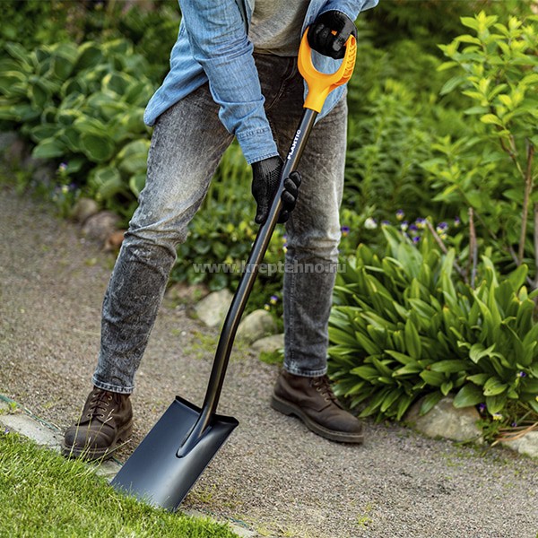 Закругленное лезвие лопаты Plantic Terra позволяет легко обрабатывать кромку газона, копать и разрыхлять землю