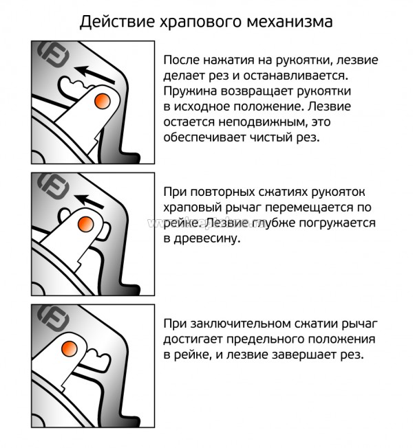 Особенность работы секатора – рез в три этапа. Вы делаете одно нажатие, затем ослабляете сжатие. Второе нажатие – ослабляете. Третье нажатие – финальный рез. При этом двигать или крутить секатор не нужно. Лезвие уже погрузилось в древесину и зафиксировалось в ней.