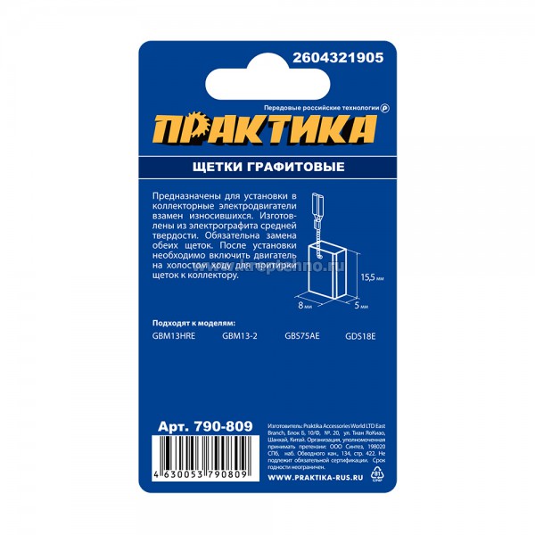 Щетки графитовые для BOSCH №2604321905 с пружиной (5x8x15,5 мм) автостоп, ПРАКТИКА