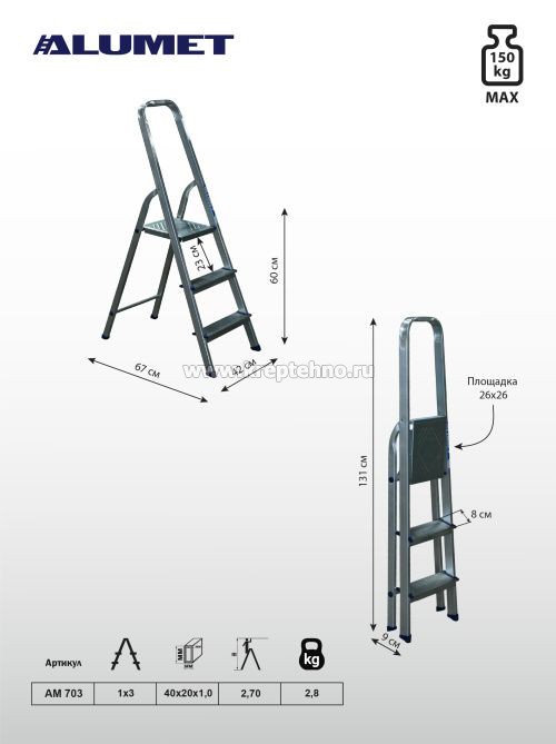 Стремянка алюминиевая изготовлена из высокопрочного алюминиевого профиля.
