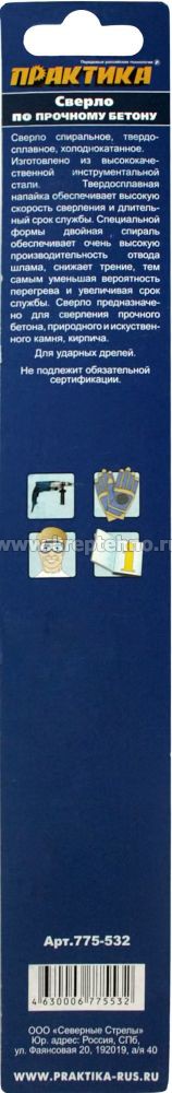 - Сверло предназначено для сверления прочного бетона, природного и искуственного камня, кирпича.