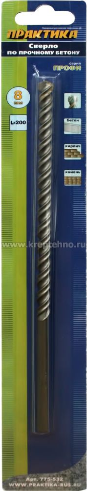 Сверло по бетону 8*200 ц/х ударное удлиненное, 4-х спиральное Профи, ПРАКТИКА