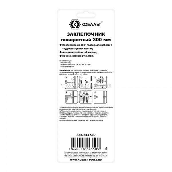Заклепочник 300мм поворотный 0-360град, заклепка до 4.8мм, КОБАЛЬТ