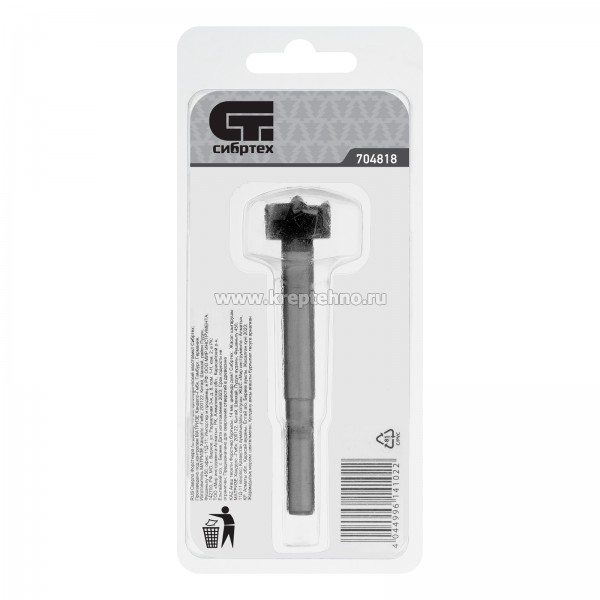 Сверло Форстнера по дереву Сибртех с цилиндрическим хвостовиком, используется для получения глухих отверстий диаметром 18 мм в древесине, ДСП, ДВП и других материалах.