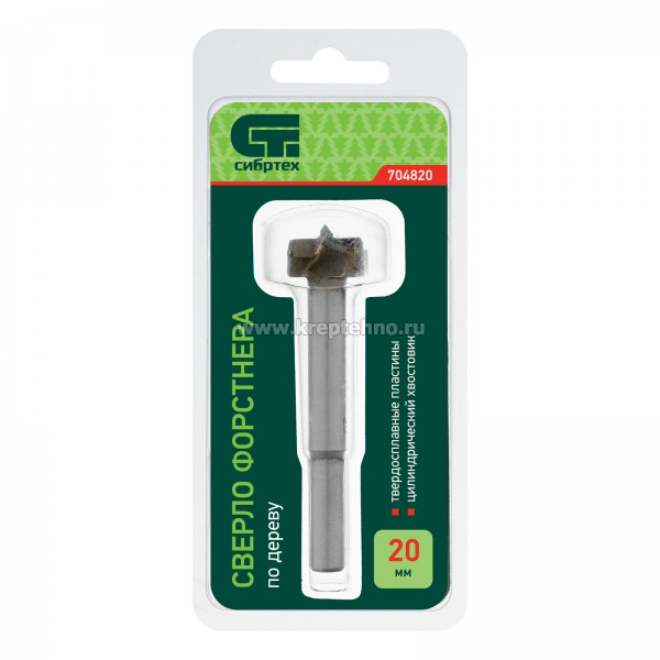 Сверло Форстнера по дереву Сибртех с цилиндрическим хвостовиком, используется для получения глухих отверстий диаметром 20 мм в древесине, ДСП, ДВП и других материалах.