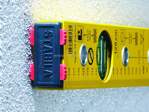 Уровень тип 70 Electric, 120см (1 верт., 1 гориз., точность 0,5мм/м) для электрика, STABILA На корпусе ватерпаса находятся сквозные маркировочные отверстия на специально-заданном расстоянии. За счет одной рабочей операции можно произвести точную и правильную разметку под выключатели или электрические розетки, как в горизонтальном, так и в вертикальном положении. Расстояние между отверстиями по центру составляет 71 мм согласно норм DIN 49075. Защитные колпачки, имеют с обеих сторон боковые накладки (выступы) для предотвращения соскальзывания ватерпаса, при прикладывании его к скользкой или гладкой поверхности. Гладкостенный прямоугольный алюминиевый профиль. Порошковое лаковое покрытие, нанесенное электростатическим методом. Технические характеристики: