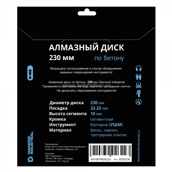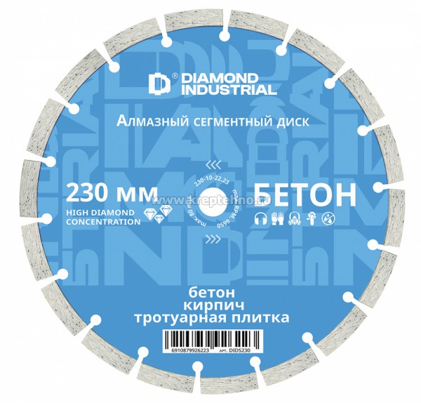 Диск алмазный сегментный DIDS230 Diamond Industrial предназначен для сухой резки бетона, кирпича, камня, а также других строительных материалов.
