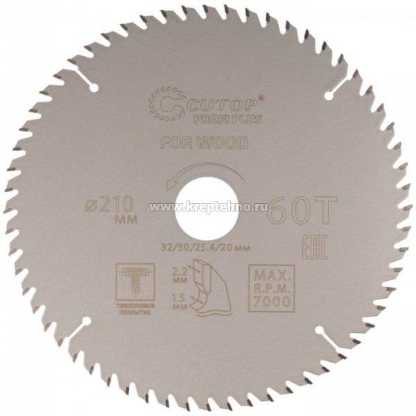 Диск пильный 210х1,5/2,2х32/30/25,4/20 мм 60Т по дереву, с тефлоновым покрытием, CUTOP Profi Диск пильный по дереву Cutop Profi Plus с тефлоновым покрытием.