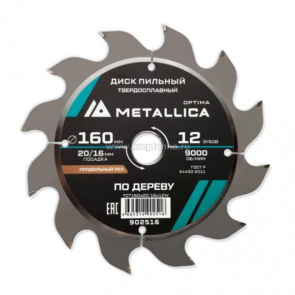 Диск пильный 160х2,4х20/16мм 12Z по дереву, для чернового продольного пиления, METALLICA Optima