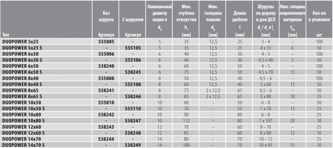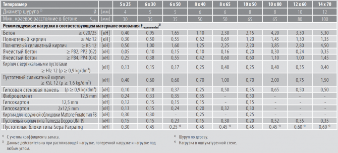 ТЕХНИЧЕСКИЕ ДАННЫЕ:  НАГРУЗКИ: Максимальные рекомендуемые нагрузки 1) для одиночного дюбеля. Данные значения нагрузки действительны для дюбелей с шурупами по дереву указанного диаметра в соответствии с DIN 571