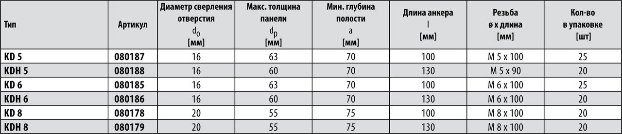 Длинная резьбовая шпилька раскрывающихся дюбелей KD и KDH позволяет использовать их с листовыми материалами различной толщины и обеспечивает максимальную гибкость. Встроенная пружина действует на раскрывающиеся элементы пружинного дюбеля немедленно, обеспечивая простую установку. Широкие ребра обеспечивают оптимальное распределение нагрузки. Это придает высокую несущую способность. Технические характеристики: