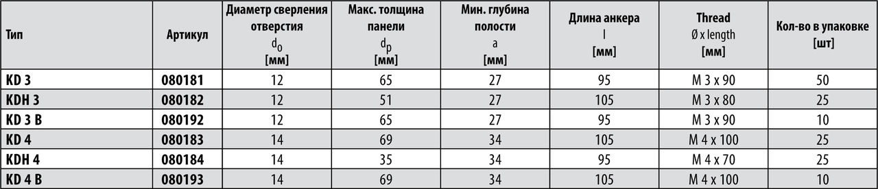 Длинная резьбовая шпилька раскрывающихся дюбелей KD и KDH позволяет использовать их с листовыми материалами различной толщины, что обеспечивает максимальную гибкость данного метиза. Встроенная пружина действует на раскрывающиеся элементы пружинного дюбеля KD 3+4 и KDH 3+4 немедленно, обеспечивая простую установку. Широкие ребра обеспечивают оптимальное распределение нагрузки, что дает высоку несущую способность. Технические характеристики: