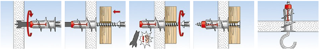 Металлический носик дюбеля. Отламывается при установке шурупа При завинчивании дюбель "раскрывается" лучше аналогов, закрепление в отверстии лучше Самый распространенный шлиц Phillips (PZ 2) для удобной установки большинства инструментами Самосверлящий носик дюбеля с тремя точками опоры, быстрое и эффективное формирование отверстия Дополнительные ребра против прокручивания Плотная посадка в отверстии Монтаж в двухслойный гипсокартон: