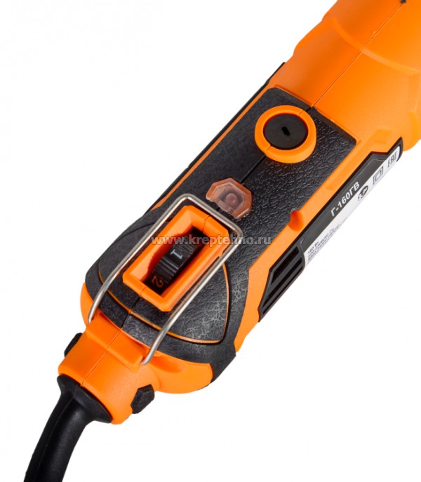 • На корпусе расположена кнопка регулировки скорости вращения вала. Частота вращения может быть от 9000 до 34000 об/мин.