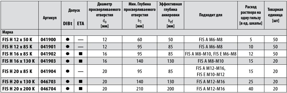Систему можно использовать с одним из следующих инъекционных составов: FIS V, FIS VS, FIS VW или FISP. Состав FIS VT также можно использовать, но он не имеет технических допусков.