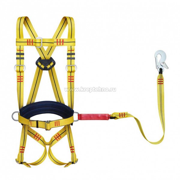 Состоит из привязи ремня с пряжкой, наплечных и набедренных лямок, кушака, двух D-колец на поясе (для удержания и позиционирования) и одного на спине и страховочного стропа из полиэфирной ленты с амортизатором. Привязь упакована в водонепроницаемый пакет и содержит паспорт и инструкцию по применению.