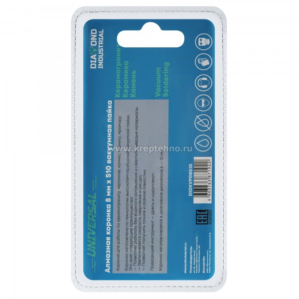 Коронки изготовлены по технологии вакуумной пайки алмазов и предназначены для получения ровных отверстий в твердых материалах: керамогранит, гранит, камень, керамика, кафель, мрамор и т.д.