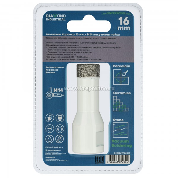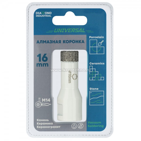 Коронка алмазная по керамике и керамограниту 16 мм/M14 для УШМ, Diamond Industrial