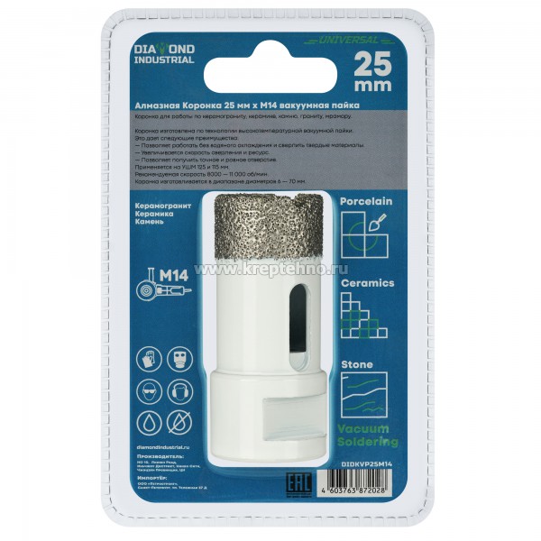 Коронка алмазная по керамике и керамограниту 25 мм/M14 для УШМ, Diamond Industrial