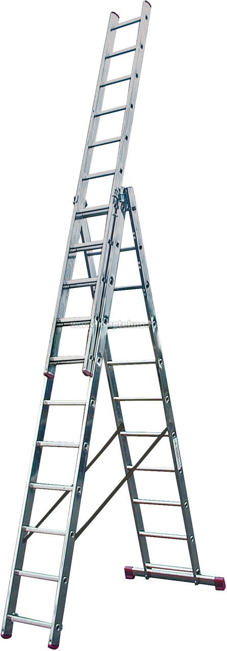 Трехсекционная, универсальная алюминиевая лестница. Может применяться в качестве приставной, раздвижной лестницы и стремянки. Дополнительная функция установки на различных высотах, например лестничных маршах